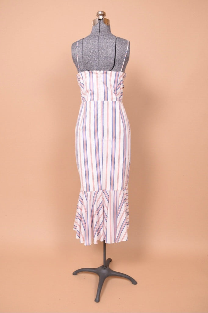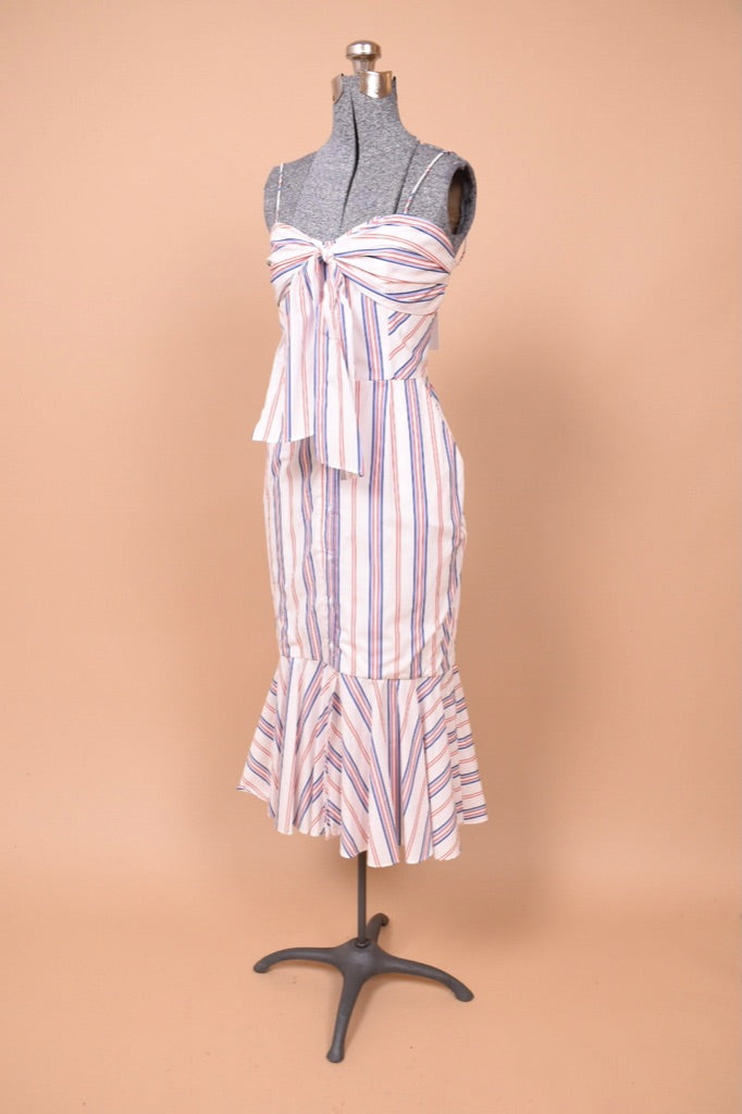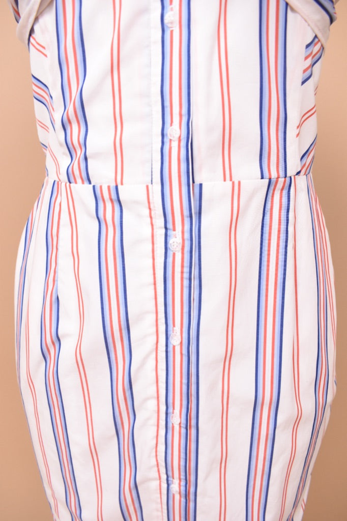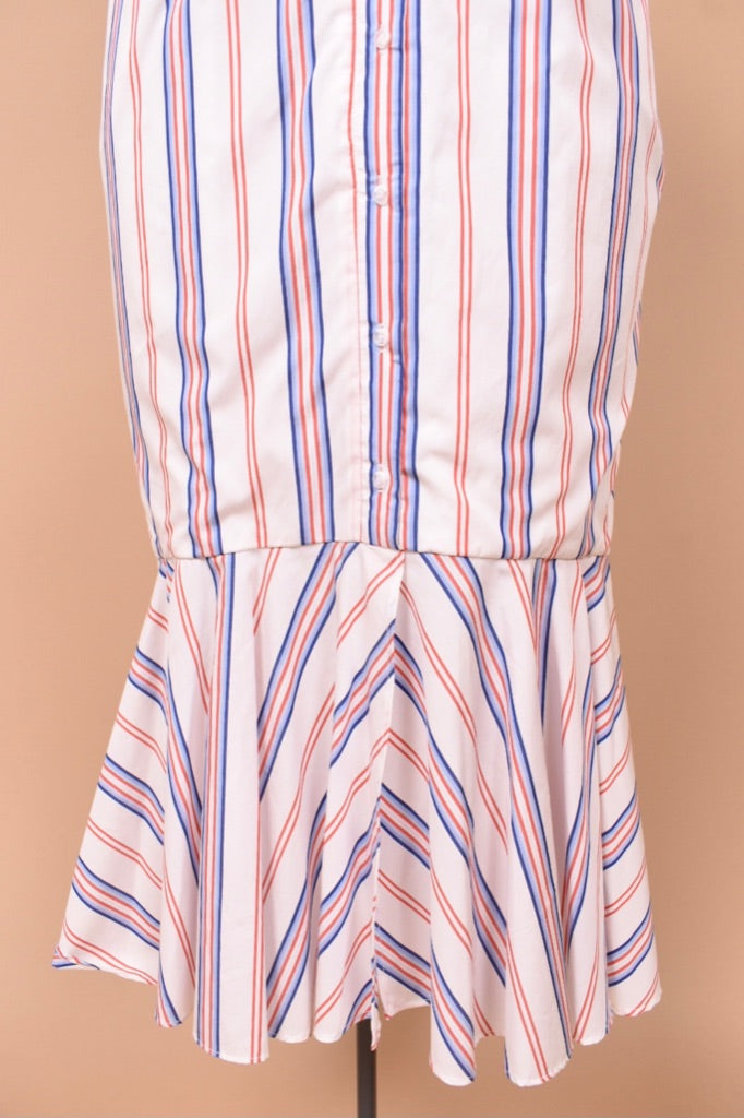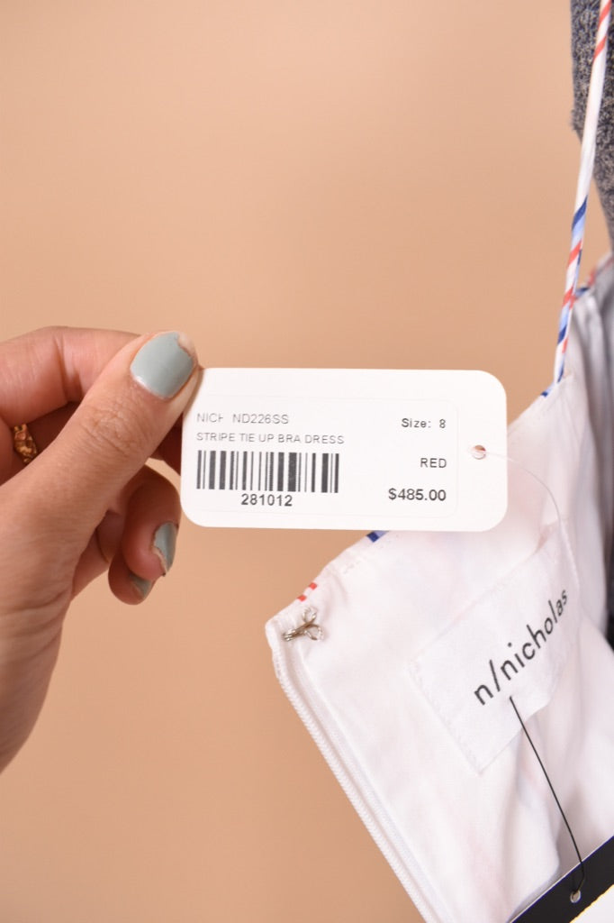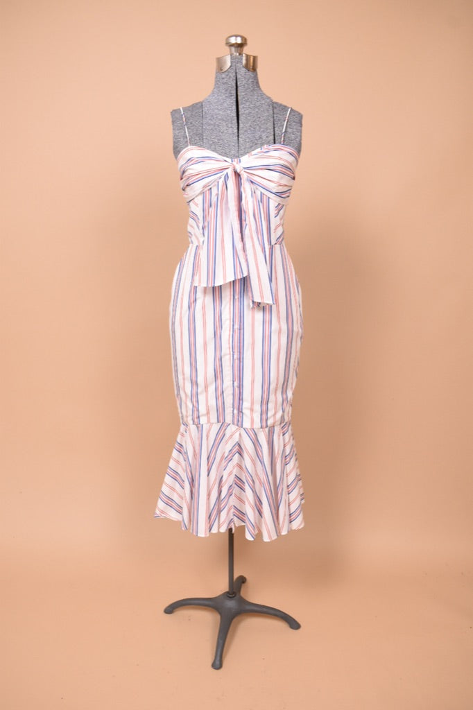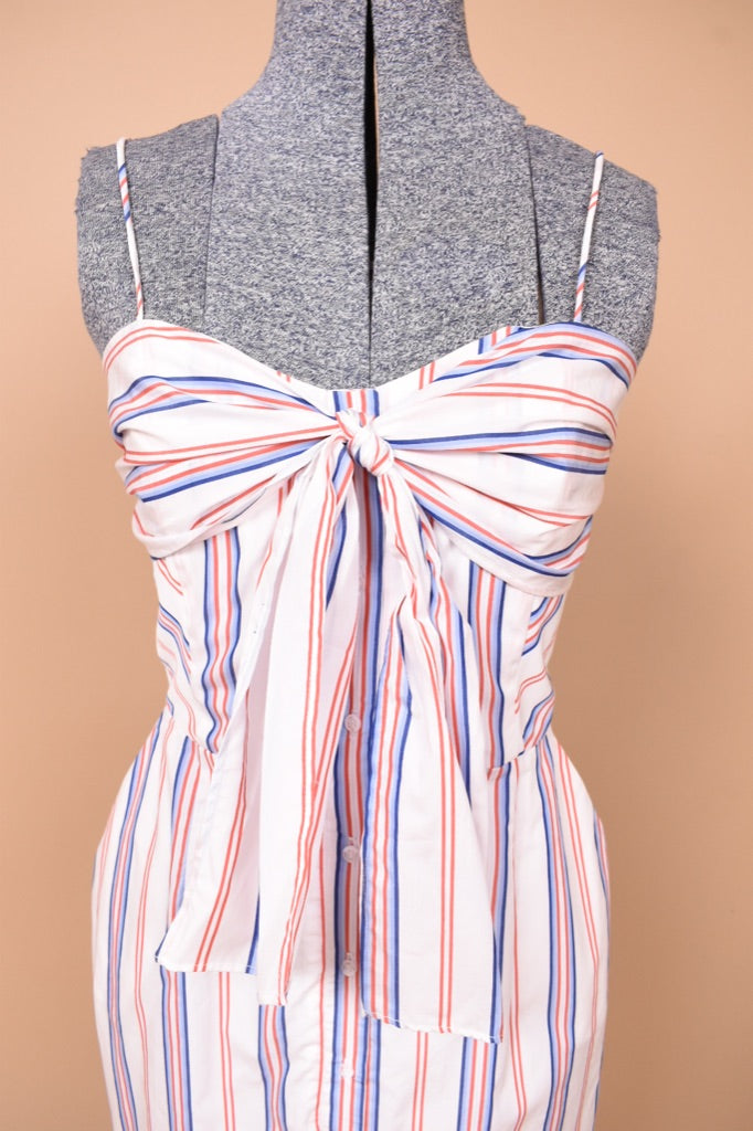 This Australian designer red, white, and blue midi dress by N/Nicholas is a chic summer piece! This striped cotton dress buttons up the front and has an adjustable tie bow on the bust. The thin tank straps on this dress are not adjustable. This piece has a unique mermaid silhouette, tight to the body and then flares out at the hem. Wear this dress with your favorite wedged heels this summer for a full coastal granddaughter aesthetic. And yes— it has pockets!