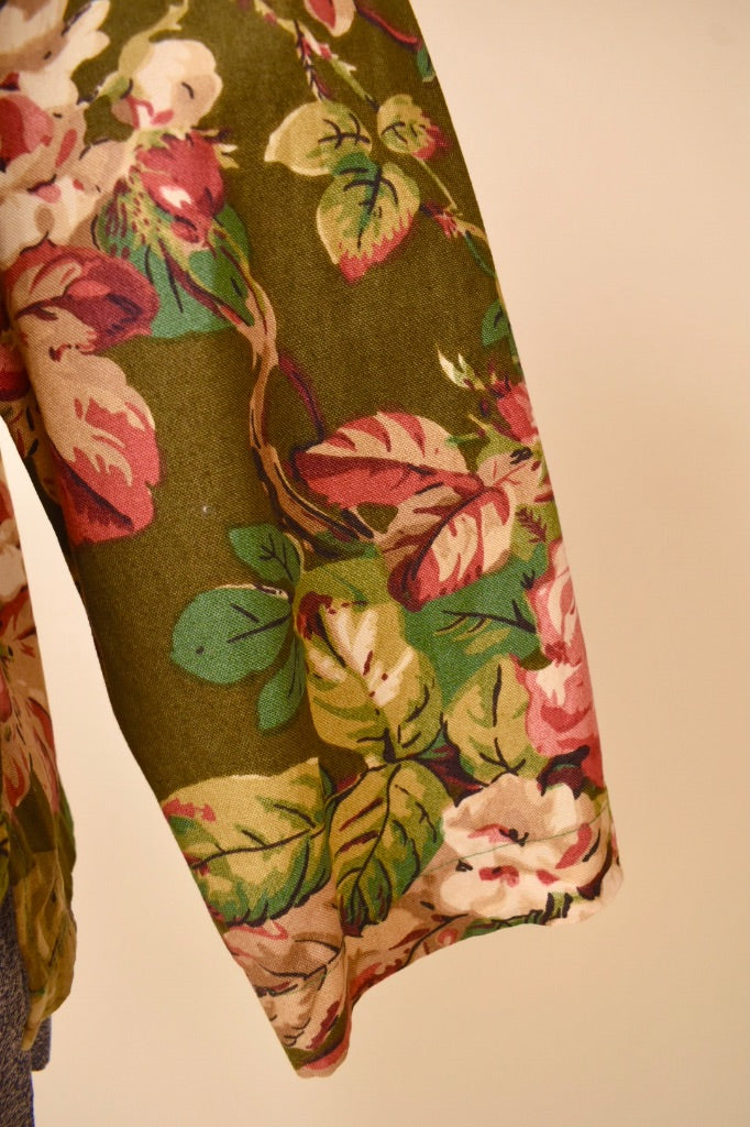 This green and pink chore coat-inspired jacket is a great piece for any gardener or flower lover! The jacket is made from a stiff olive green cotton with a deep rose-colored floral print. The jacket has two deep pockets at the waistline and four cream colored buttons. This piece was made in New Hampshire and has a 90s feel to it! The locally made quality can be felt in the material and attention to detail in the making of this jacket. Pair it with jeans and a Chelsea boot for a classic New England look.